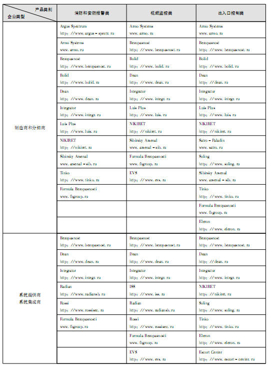 為了便于我們國內(nèi)有意向進(jìn)入俄羅斯市場(chǎng)的企業(yè)準(zhǔn)確尋求到俄當(dāng)?shù)乇容^有實(shí)力的合作商,現(xiàn)將這300多家安防企業(yè)內(nèi)具備較強(qiáng)實(shí)力的公司列出,供我們國內(nèi)企業(yè)參考,詳情見下表: